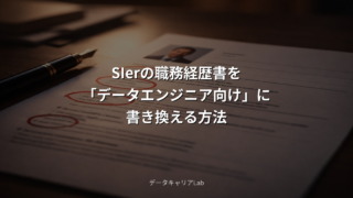 SIerからデータエンジニアへ転職した筆者が、職務経歴書の書き方と使えるテンプレートを公開。「バッチ開発」→「ETLパイプライン」など、SIer用語をデータエンジニア向けに翻訳する具体的な書き換え例も掲載。